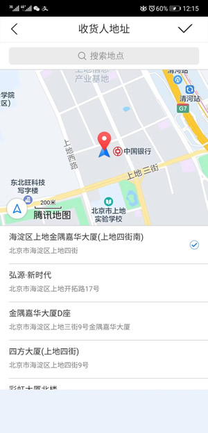 还有一类地址信息是与当前位置无关的,但是也需要能在地图上直观展现,或者从地图上选取,以方便用户的使用。例如:在外跑业务的销售员,填报客户的送货单的时候可能不是往当前谈业务的地方送货,而是其他位置的仓库或者店面,这时可以使用地址进行填报:
