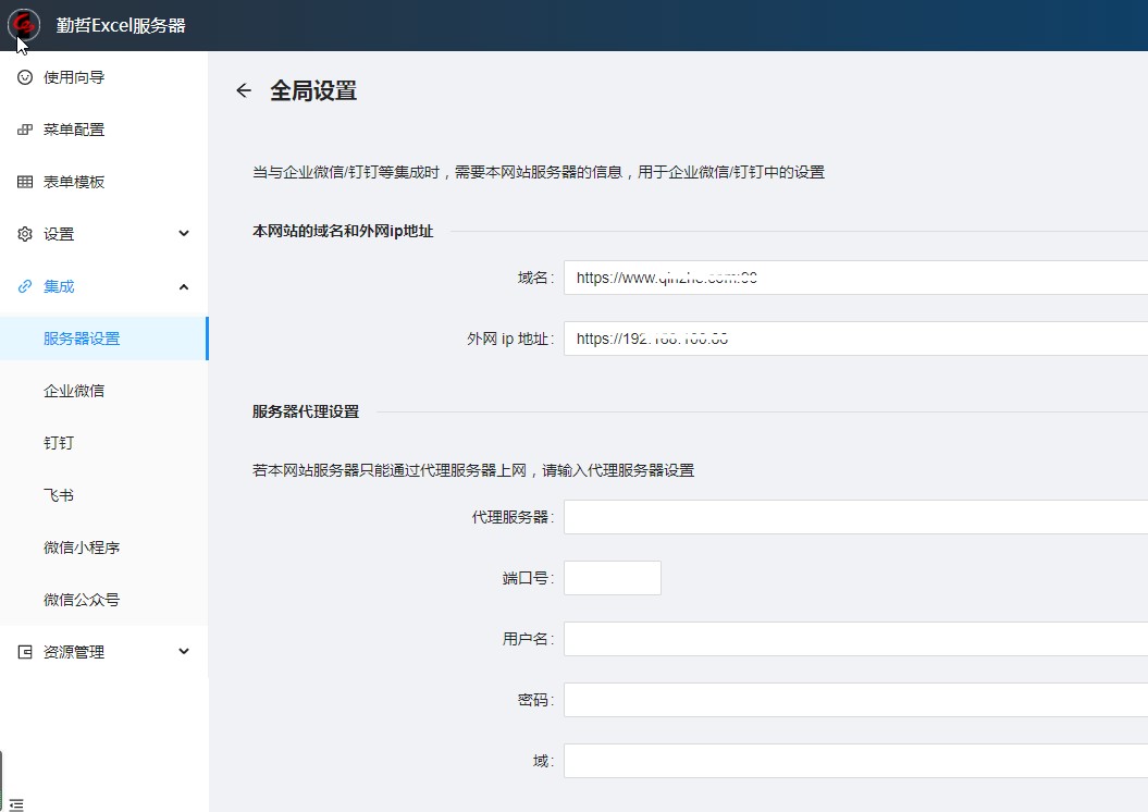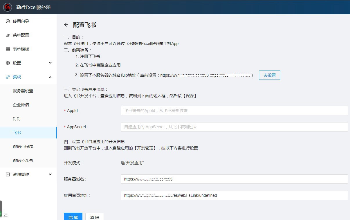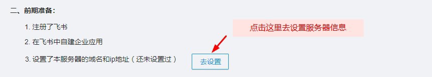 看“配置飞书”页面上“前期准备”的部分第3项,如果显示“还未设置过”,则点击右侧的【设置】按钮,去设置服务器(也就是Excel服务器填报网站所在的域名和外网ip地址)。