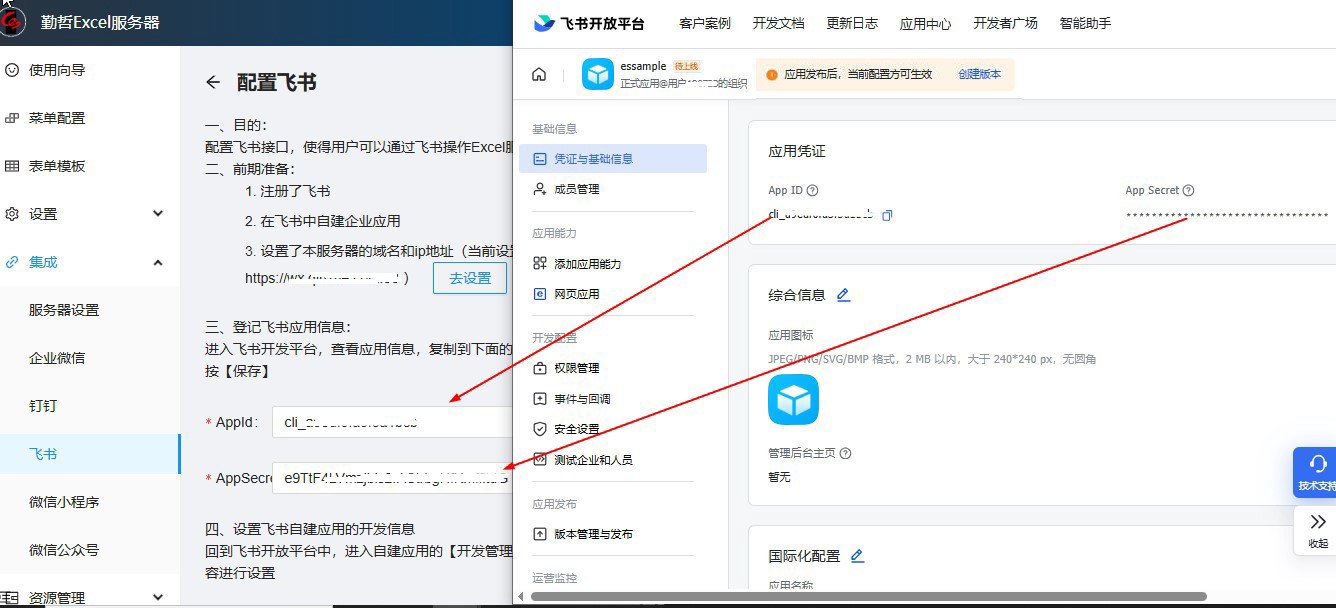 所谓应用对接,即我们要让飞书自建应用和Excel服务器应用互相能找到对方。
