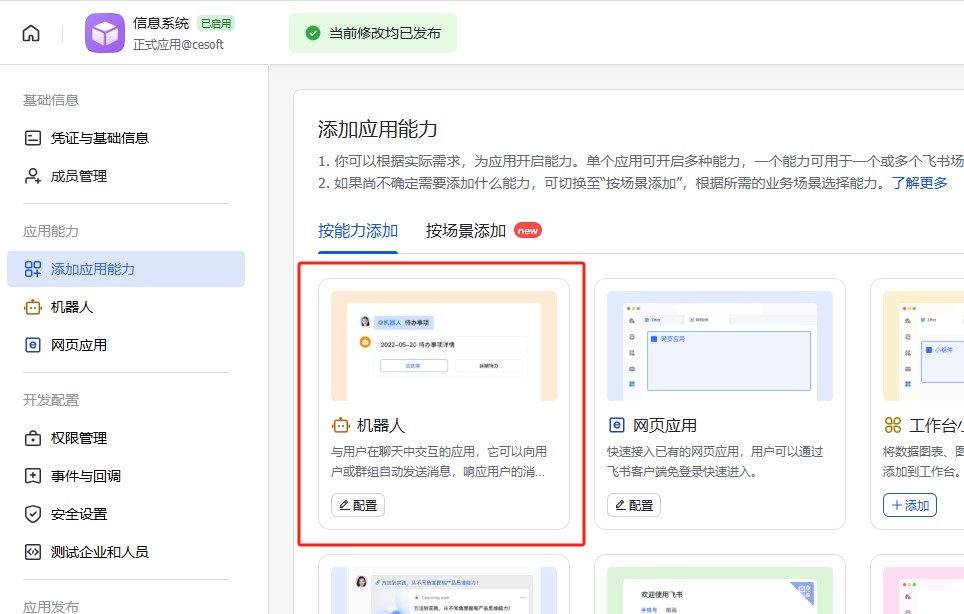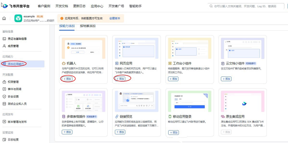 回到飞书开放平台,点击左侧菜单栏的【添加应用能力】,添加“网页应用”、“机器人”。