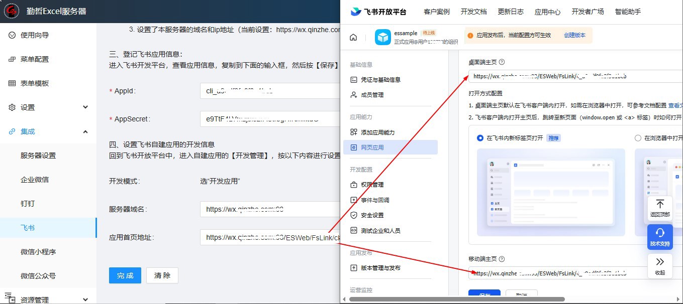 将Excel服务器配置飞书页面上的“应用首页地址”,填到飞书网页应用当中的桌面端主页和移动端主页当中,点【保存】。