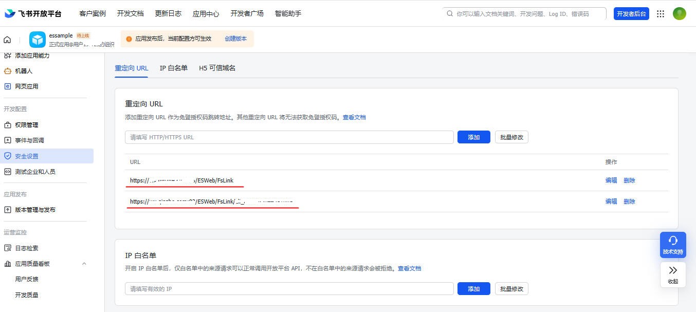 选择“安全设置”菜单,添加两条重定向URL: